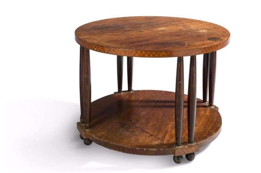 Guéridon à plateau circulaire en placage de bois teinté présentant deux frises à damier en marqueterie de bois exotique reposant sur huit montants fuselés reliés par une tablette d'entretoise et terminé par des pieds boules.