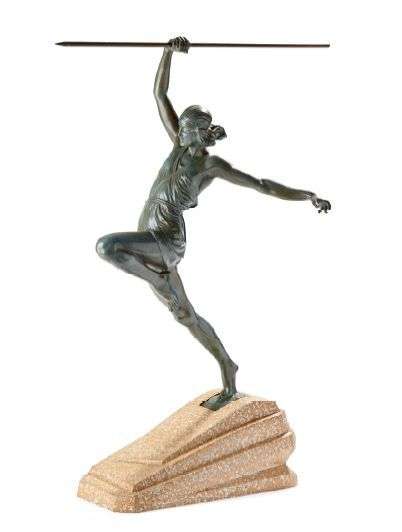 Epreuve en régule à patine verte reposant sur une base à gradins en pierre blanche.