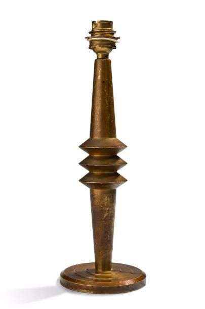 Pied de lampe en bronze doré à fût conique à trois bagues reposant sur une base circulaire.