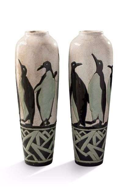 Suite de deux vases coniques à col resserré en faïence émaillée craquelée blanche à décor tournant de pingouins et d'une frise de motifs géométriques émaillés verts et noirs pour l'un et bleus profonds et verts pour l'autre.