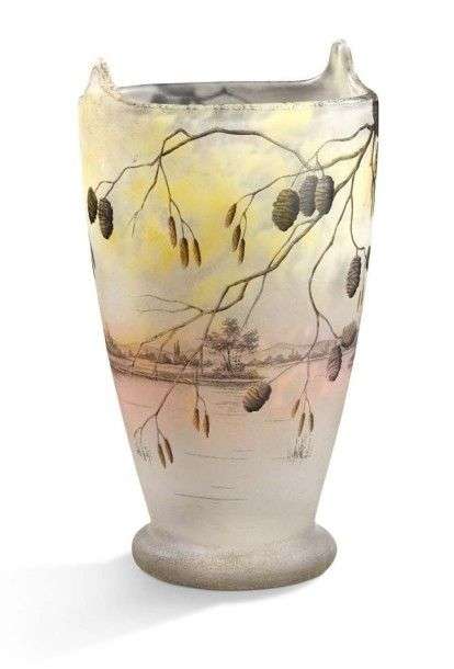 Vase ovoïde à deux anses pincées à chaud en verre doublé à décor dégagé à l'acide d'un paysage lacustre aux pommes de pain en grisaille sur fond givré opaque marmoréen jaune et rose.
