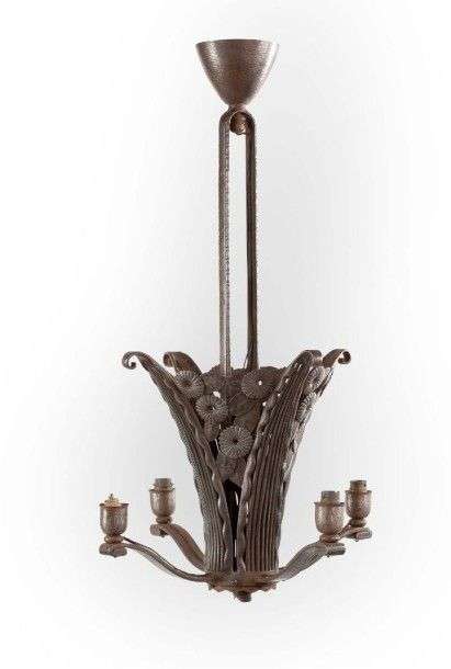 Lustre en fer forgé à fût ajouré de motifs floraux et feuillagés présentant quatre bras de lumières.