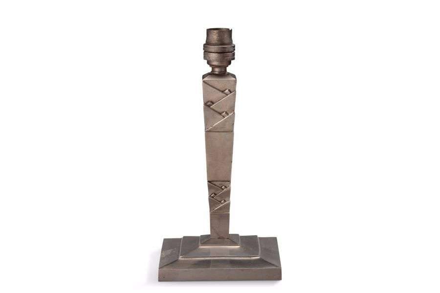 Lampe en métal nickelé à fût conique cranté à décor géométriques et reposant sur une base carrée à gradins.