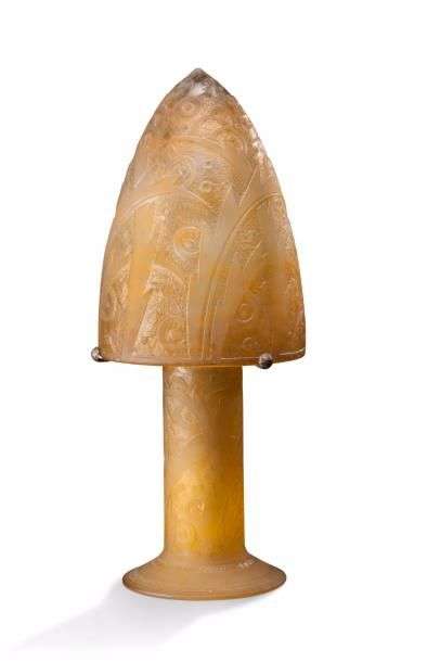 Importante lampe obus en verre teinté jaune à réflecteur conique et fût tubulaire évasé à décor dégagé à l'acide de motifs géométriques.