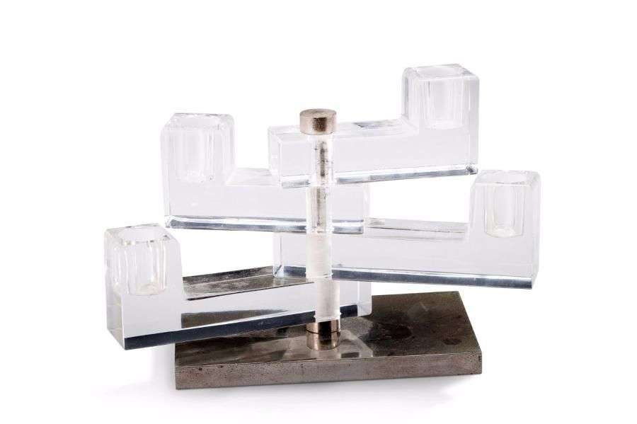 Bougeoir moderniste à quatre bras de lumière orientables en verre translucide reposant sur une base rectangulaire en bronze argenté.