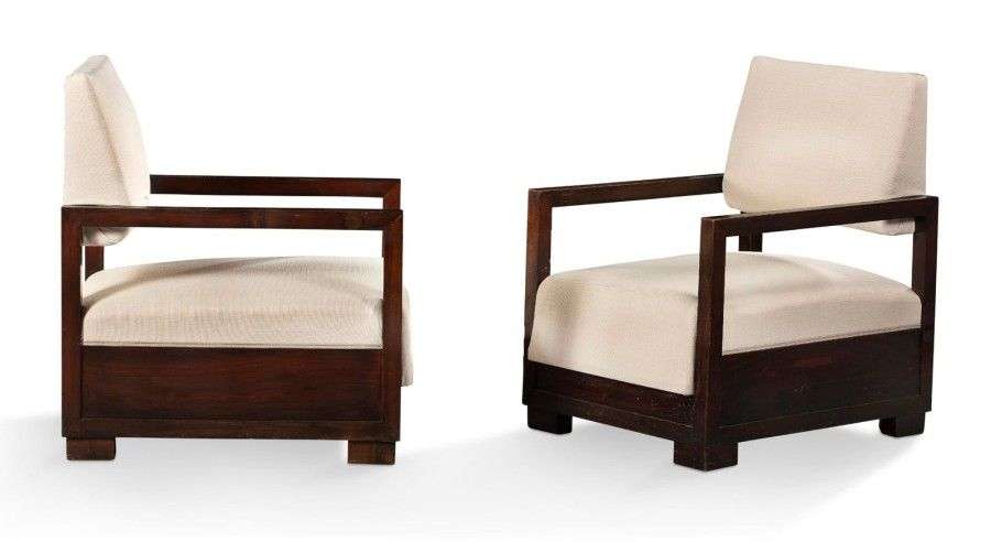 Paire de fauteuils en hêtre teinté à dossier et accotoirs droits reposant sur quatre pieds cubiques.
