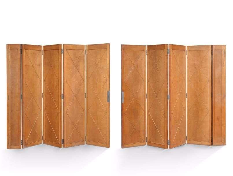 Paire de cloisons repliables à quatre volets articulés en placage de sycomore présentant des baguettes en relief formant des losanges.