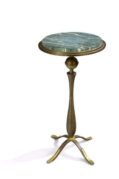 Guéridon à plateau circulaire en marbre gris reposant sur un piétement en bronze à fût de forme balustre terminé par quatre pieds griffes.