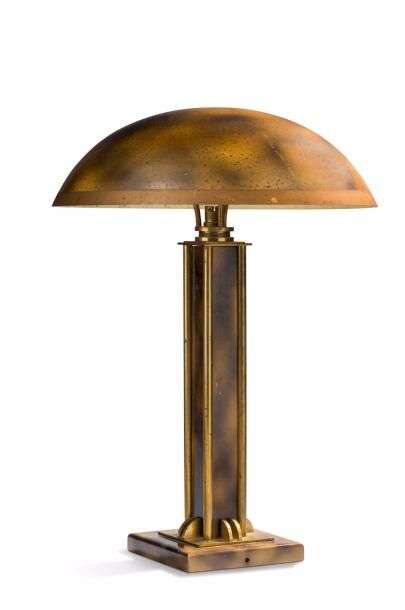 Lampe de bureau en métal et bois laqué brun orangé et doré à fût carré serti de tubes de laiton doré surmonté d'un abat-jour hémisphérique.
