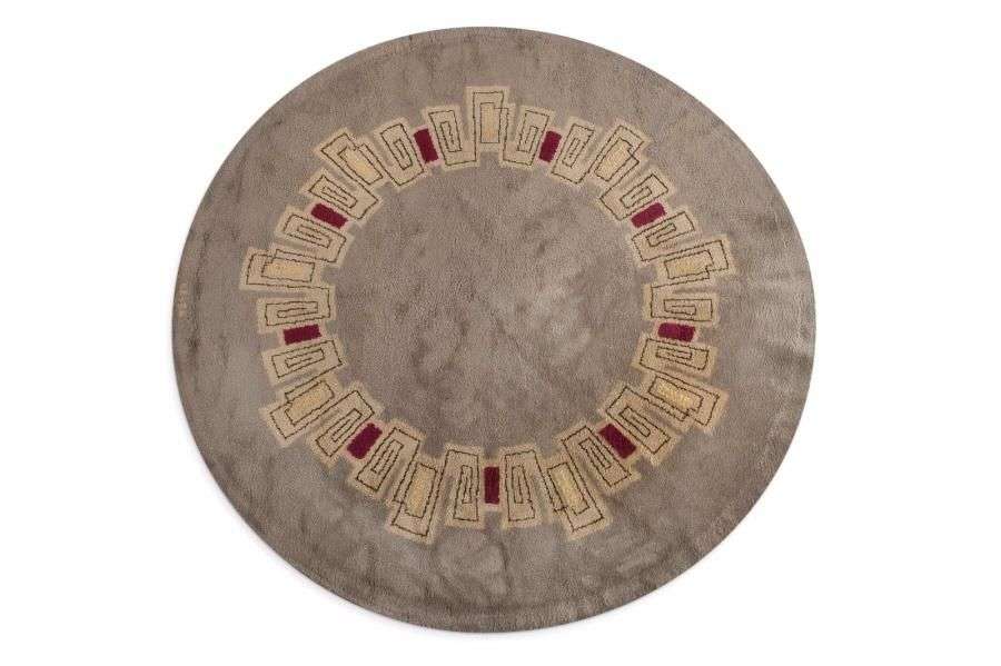 Tapis circulaire en laine rase à motifs géométriques concentriques rouges, jaunes et noirs sur fond gris.