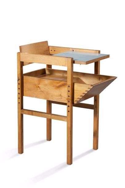 Chaise d'enfant en frêne à tablette amovible et de taille réglable.