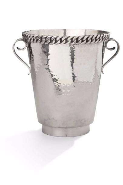 Seau à champagne en métal argenté martelé à deux anses à volutes orné d'une large chaine à maillons plats.