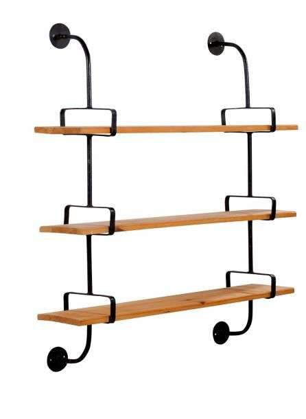 Etagère murale composée d'une structure en métal tubulaire laqué noir évidée pouvant recevoir trois étagères en bois superposées.