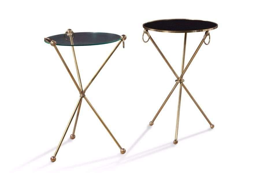 Suite de deux guéridons à armature tubulaire en laiton doré tripode enserrant des plateaux circulaires en verre translucide et en verre teinté noir et à décor d'anneaux de tirage.