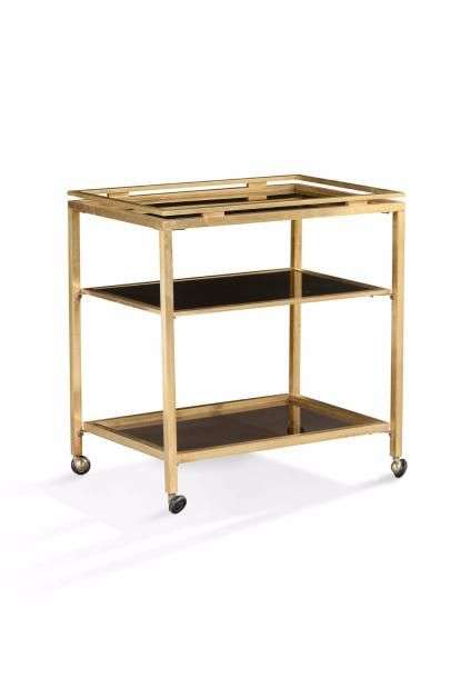 Desserte roulante en bronze doré à trois plateaux rectangulaires superposés enserrant des verres.