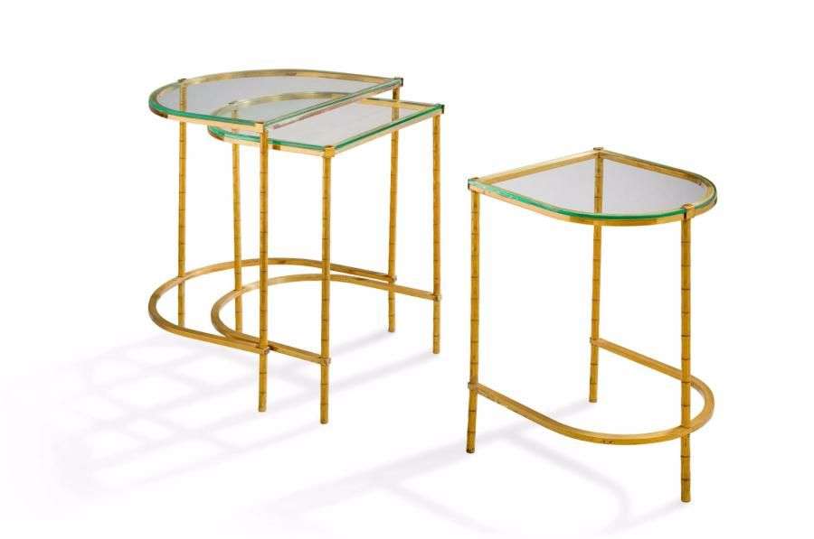 Suite de trois tables gigognes de forme demi lune à structure en laiton doré à montants tubulaires rainurés enserrant des verres translucides.