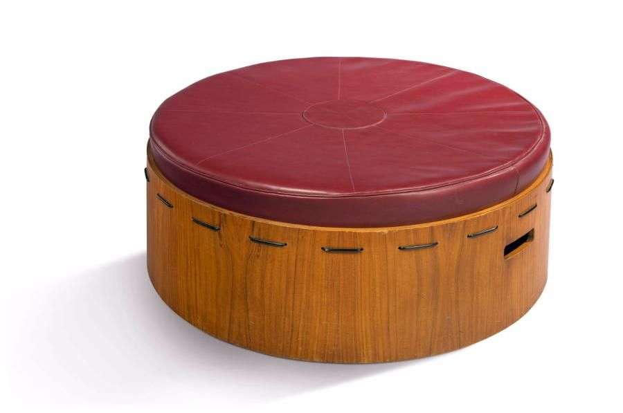 Pouf circulaire en placage de teck thermoformé à assise en cuir bordeau.