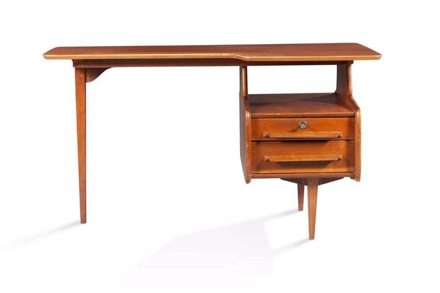 Bureau en placage de teck à plateau à découpe mouvementée présentant un caisson à deux tiroirs et reposant sur trois pieds fuselés.