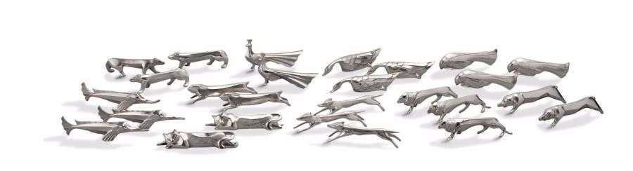 Suite de 26 porte-couteaux zoomorphes en métal argenté.