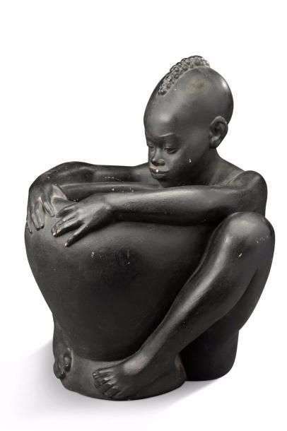 Importante vasque lumineuse en terre cuite patinée noire figurant une femme enlassant un vase.