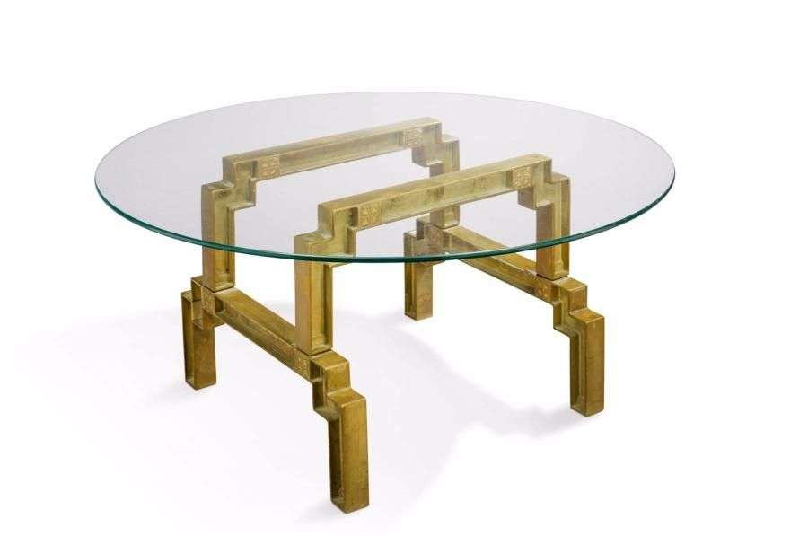 Table basse à plateau de verre circulaire en verre reposant sur une structure en bronze doré composée de montants quadrangulaires évasés coudés superposés.