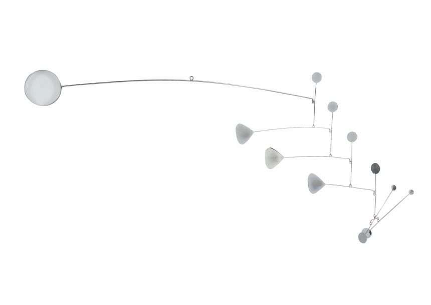 Sculpture mobile présentant dix bras articulés terminés par des disques en métal chromé.