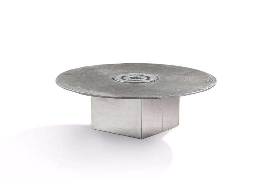 Table basse à plateau circulaire en fonte d'aluminium à motifs géométriques reposant sur une base quadrangulaire en métal.