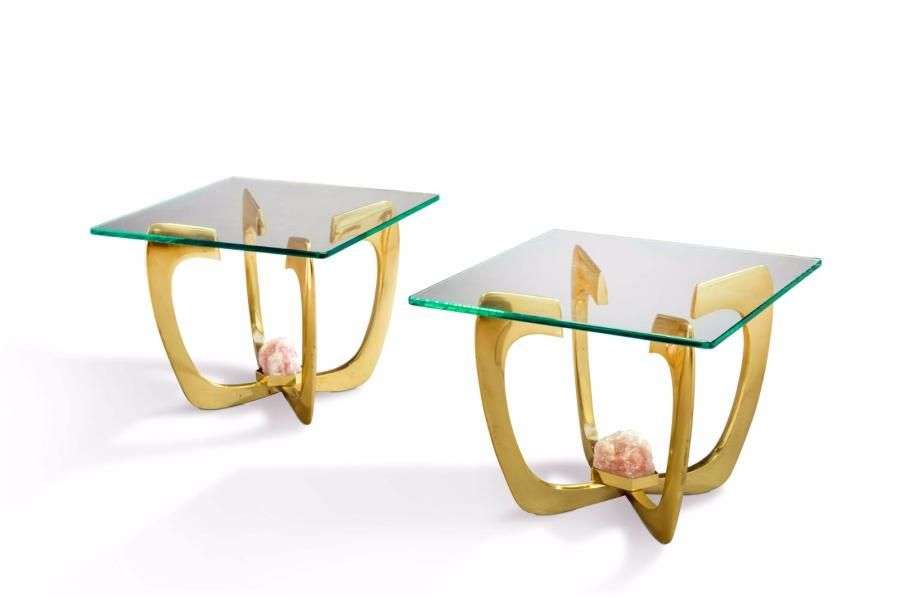 Paire de bouts de canapé en bronze doré à plateau carré en verre translucide composé de quatre montants arqués présentant en son centre un élément en quartz rose.