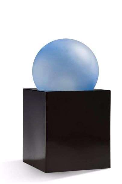 Lampe modèle "Alba" à base cubique en verre opalin noir et à reflecteur sphérique en verre satiné bleu.