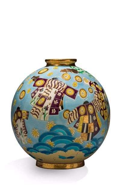 Vase boule en faïence émaillée polychrome figurant des kimonos, des éventails et des volatiles.