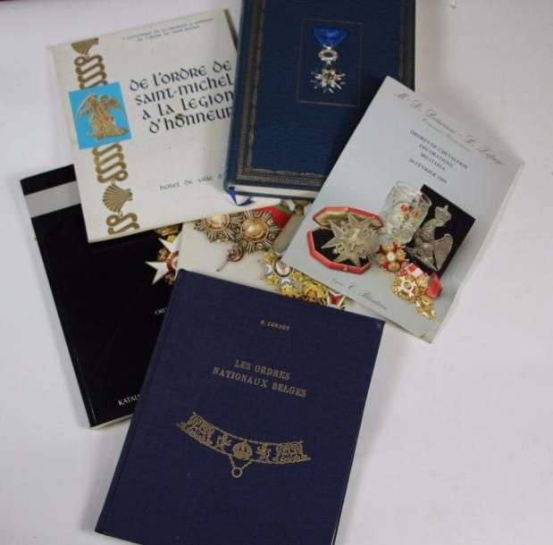 Lot de livres sur les Ordres de chevalerie et décorations. On joint un lot de catalogue de vente. Environ 30 ouvrages