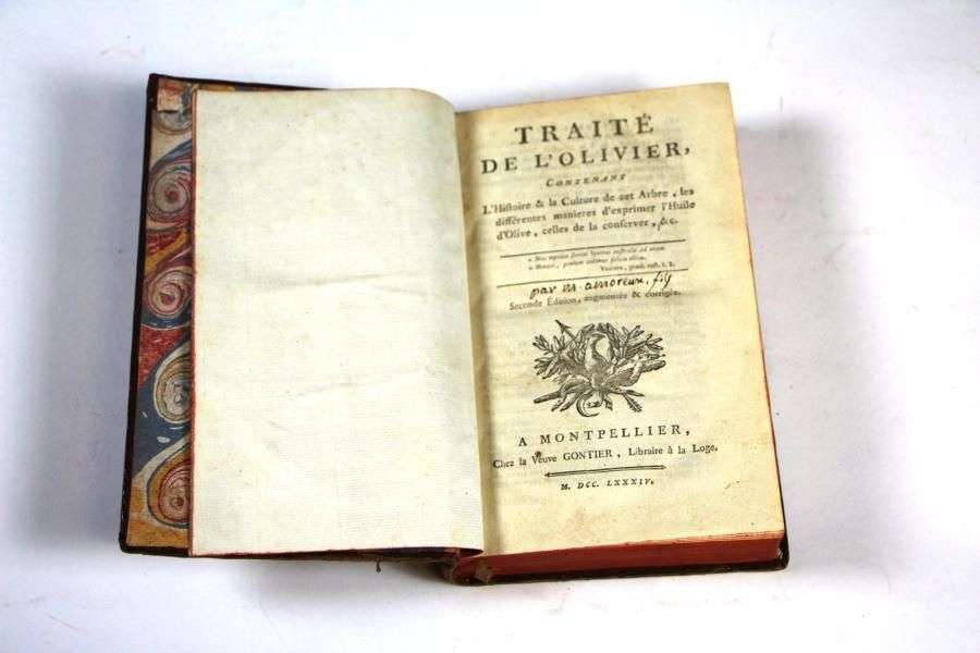 « Traité de l'Olivier, contenant l'histoire & la culture, les différentes manières d'exprimer l'Huile d'Olive, celles de la conserver, etc.. » Seconde Édition, à Montpellier, chez la veuve Gontier Libraire à la Loge 1784. Complet avec la page 108 énumérations des espèces connues en Languedoc, dans le comtat, en Provence. Belle exemplaire. Reliure en cuir. (usures sur les plats)
