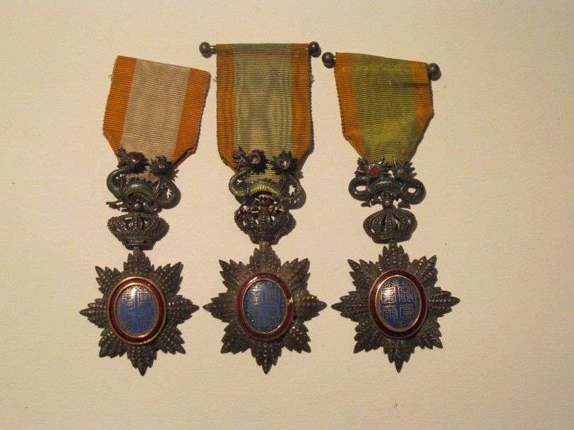 Annam Ordre du Dragon d'Annam. Lot de 3 étoiles de Chevaliers. Argent, émail (petit éclats sur l'une), ruban. B