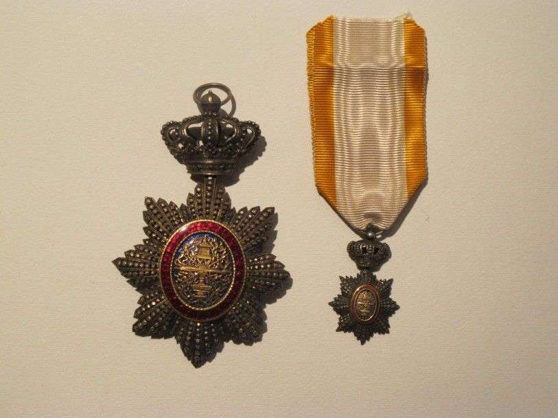 Cambodge Ordre royal du Cambodge. Étoile de Commandeur. Argent, vermeil, émail, SC. TBB On joint un Chevalier, 1/2 taille, ruban.
