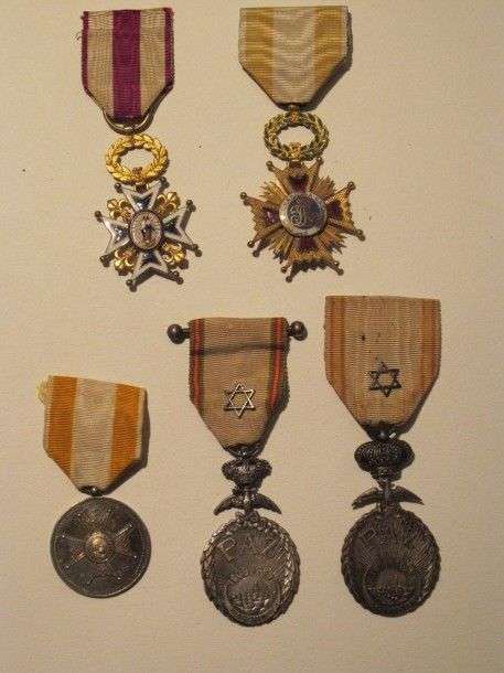 Espagne Lot : Ordre de Charles III. Croix de Chevalier. Métal doré, émail (éclats), ruban | Ordre d'Isabelle la catholique. Croix de Chevalier. Métal doré, émail (éclats), ruban | Médaille, argent, ruban | 2 Médailles de La Paz, rubans.