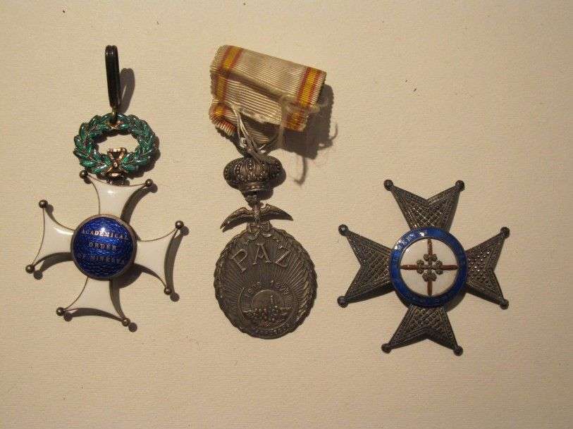Espagne Lot de 3 décorations : Mérite militaire (éclats), Ordre de Minerva (SC), Médaille de La Paz.
