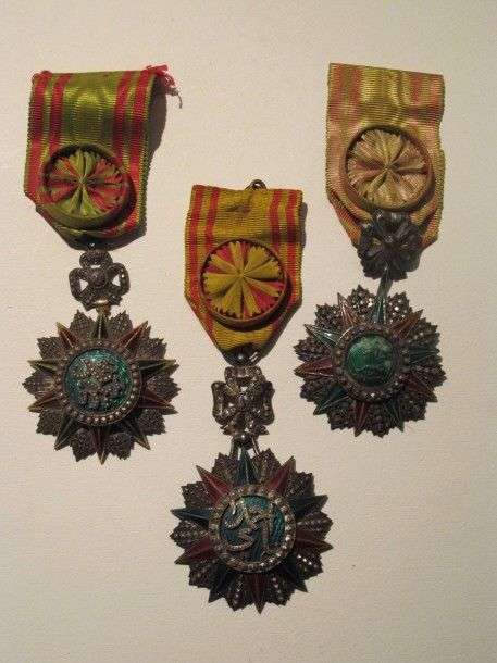 Tunisie Ordre du Nicham Iftikar. Lot de 3 étoiles d'Officier. Argent, émail (éclats), rubans à rosette.