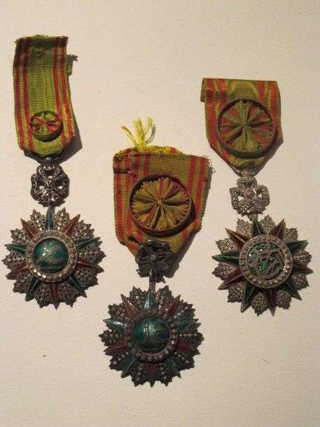 Tunisie Ordre du Nicham Iftikar. Lot de 3 étoiles d'Officier. Argent, émail (éclats), rubans à rosette.