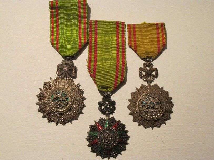 Tunisie Ordre du Nicham Iftikar. Lot de 3 étoiles de Chevalier. Argent, émail (éclats), rubans.