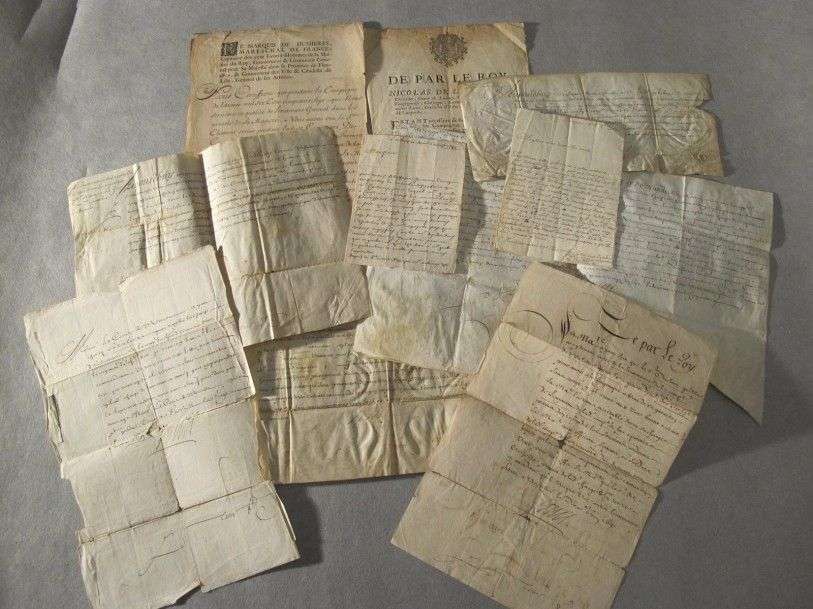 Lot de documents sur vélin et divers, du XVIIè siècle, dont : Nomination de Capitaine d'une compagnie dans le régiment de milice d'infanterie de Massillan en la Province de Languedoc, pour le Sir Payen, 1697, signatures Louis et secrétaire | Nomination de Lieutenance de 1679, 1683, 1690, 1691, 1696, signatures Louis et secrétaires sur chaque | Certificat de campagne signé par le marquis de Humières 1678 | Affiche datée de 1693. On joint 2 courriers. (légers manques sur certains documents)