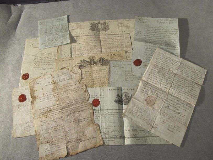 Révolution Ensemble de 10 (env.) documents militaires, dont congés de réforme, passeport Armée d'Italie, certificat de blessures, certificat de présence, congé absolu… (traces d'humidité)