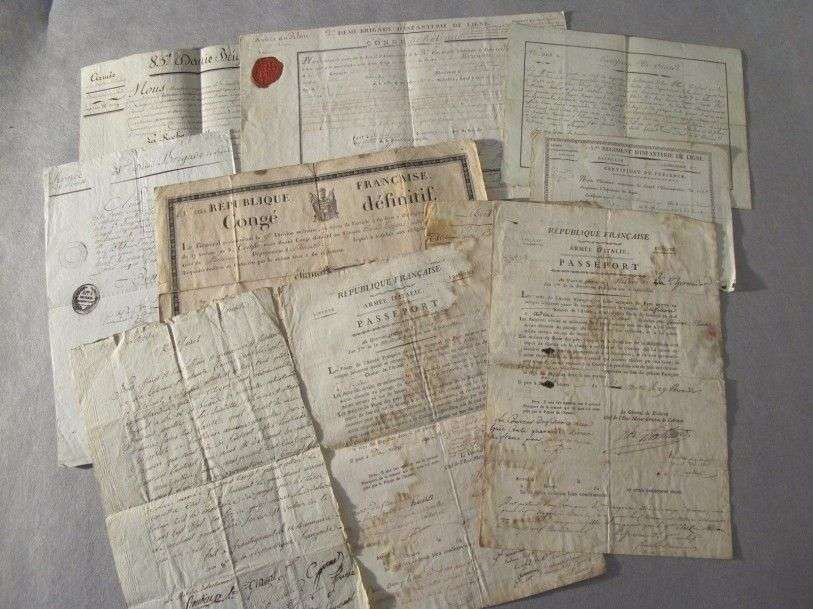Révolution Ensemble de 10 (env.) documents militaires, dont congés de réforme, passeport Armée d'Italie, certificat de blessures, certificat de présence, congé absolu… (traces d'humidité)