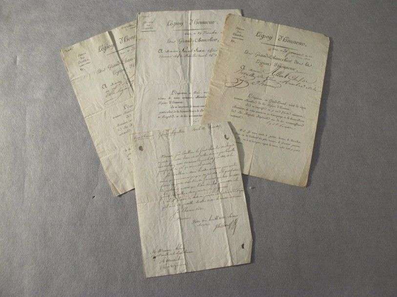 1er Empire Légion d'honneur Lot de 3 nominations, dont un Officier, en 1804 et 1808, avec autographes du Comte de Lacepède. On joint un lettre concernant un traitement en août 1815.
