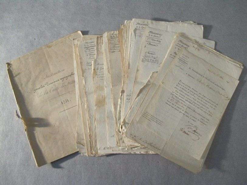 Restauration Dossier de 55 (env.) pièces, concernant Camille Boileau de Castelnau, Officier d'état-major et topographe militaire (Polytechnique en 1815), nombreux ordres de mission et de mutations, certains avec vignettes.