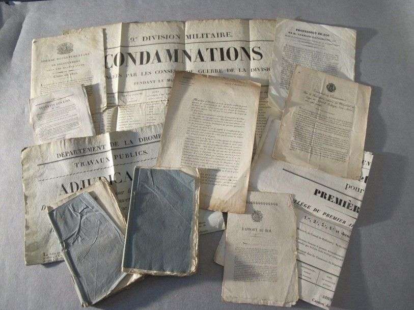 Restauration et Monarchie de Juillet Ensemble de 10 (env.) documents imprimés, dont bulletins des lois 1838, rapport au Roi, affiche de condamnation 1831, listes électorales de l'Hérault 1833, éditions originales de la monarchie selon la charte et proposition faite à la chambre des pairs par le vicomte de Chateaubriand...