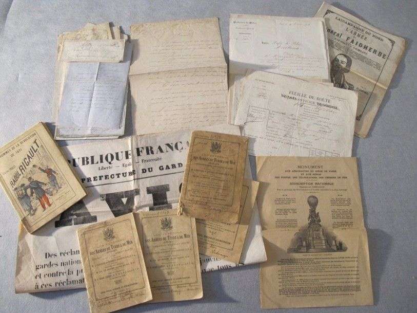 Guerre de 1870 Ensemble de 20 (env.) correspondances de Raspail Henri, du 2è Train d'artillerie, lettre de l'Armée du Rhin, affiche, 4 livrets de vétérans des armées de Terre et de Mer 1870-1871.
