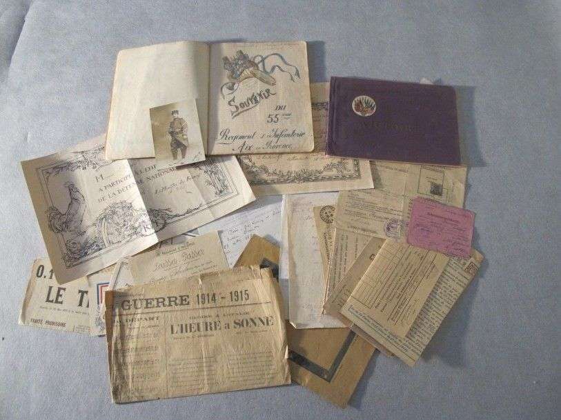 Guerre de 1914-1918 Lot de documents, dont Ausweis (Ardennes), divers tracts, livret fêtes de la victoire, laisser-passer, cartes d'alimentation, livret de chant illustré de Doro Guy du 55è Régiment d'Infanterie et divers...