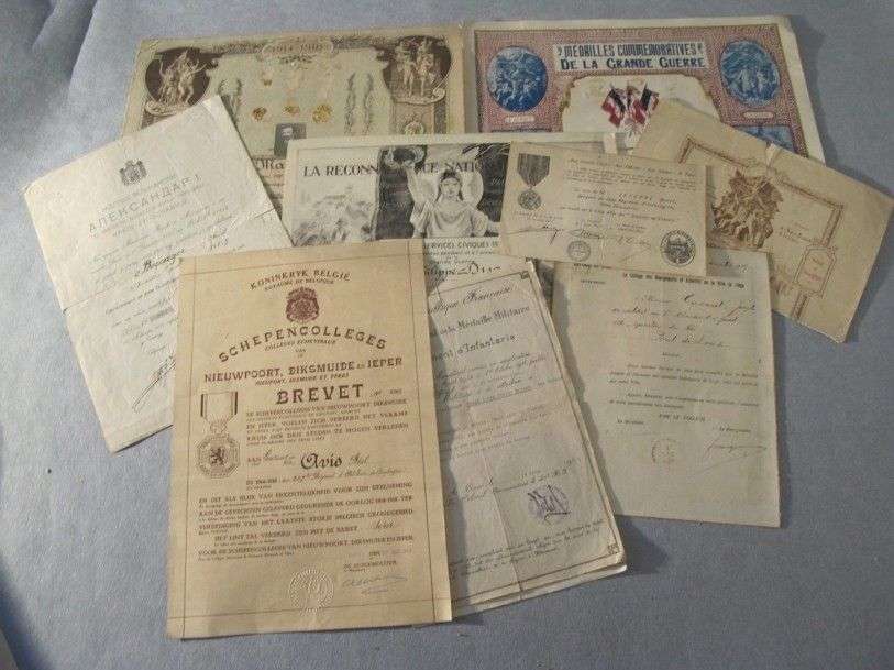 Guerre de 1914-1918 Lot de 18 (env.) diplômes et de citations, dont Dixmude, Liège, Verdun...