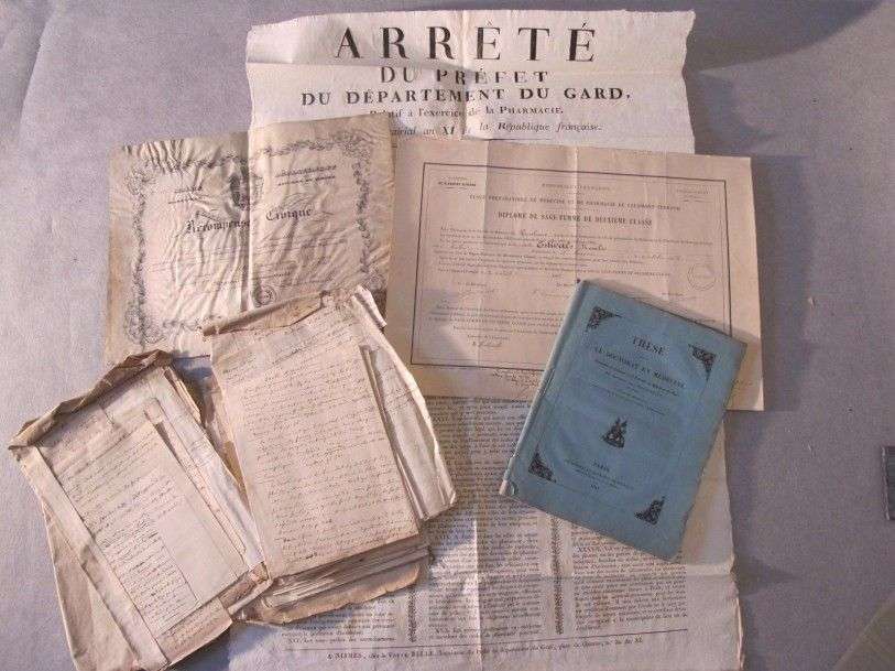 Médecine Lot de 30 (env.) documents, dont thèse de doctorat d'Antonin Jean Desormeaux, en 1844, affiche pharmacie du Gard (An XI), conférence de médecine en 1843, étonnant manuscrit sur les hémorroïdes, diplômes ...