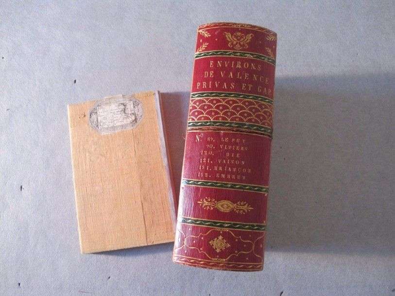 Dauphiné, environs de Valence, Privas et Gap. Ensemble de 6 cartes dans leur étui, éditées A Paris chez Piquet Géographe-graveur Quai Voltaire ou Malaquais Petit Hôtel de Bouillon, durant la première partie du XIXè siècle. Cartes : N°89 Le Puy, N° 90 Viviers, N°120 Vaison, N°121 Briançon et N°152 Embrun. Cartes richement illustrée entourées de frises, étui en maroquin rouge à frises dorées.